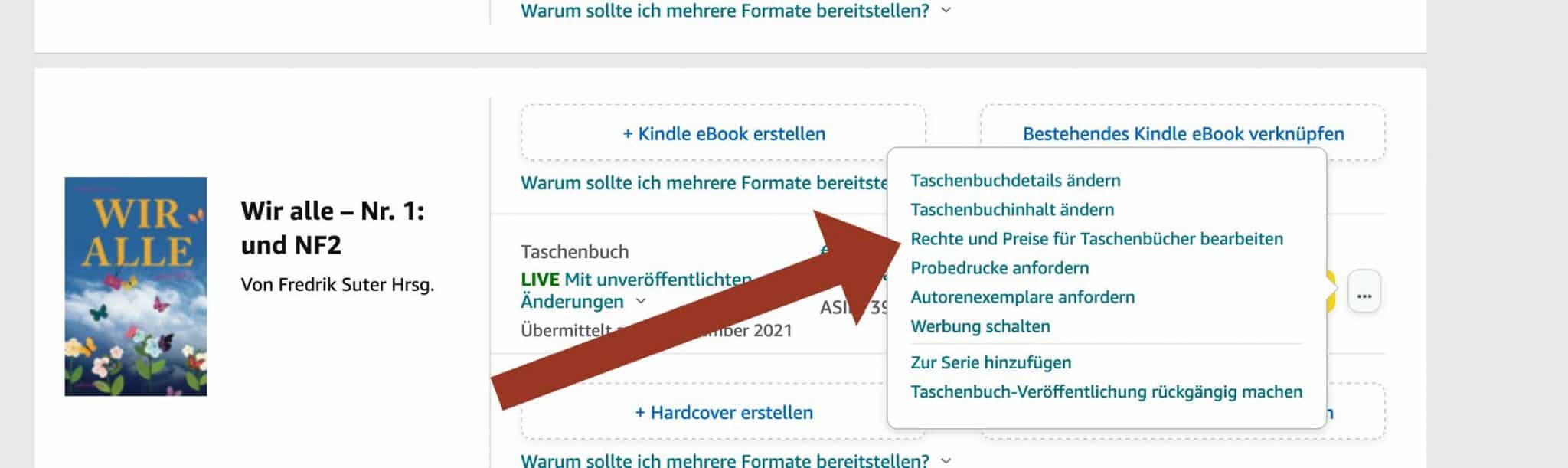 Preis ändern: Klicke auf „Preis des gedruckten Buchs ändern“ oder auf „Rechte und Preise für Taschenbücher bearbeiten“.