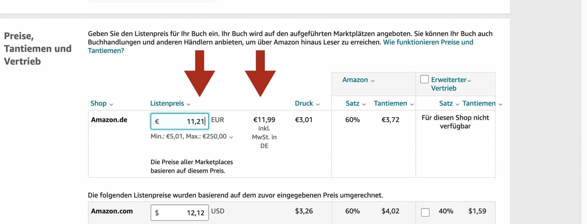Wichtig: Wenn du den Buchpreis bei Amazon KDP änderst, musst du das für alle – gedruckten – Buchausgaben machen. Falls du also auch eine eigene Auflage bei einer Druckerei hast drucken lassen, musst du den Preis auch dort ändern. Das kannst du mit einem Aufkleber machen. Oder du lässt eine Neuauflage drucken – mit dem aktualisierten Buchpreis auf der Rückseite.