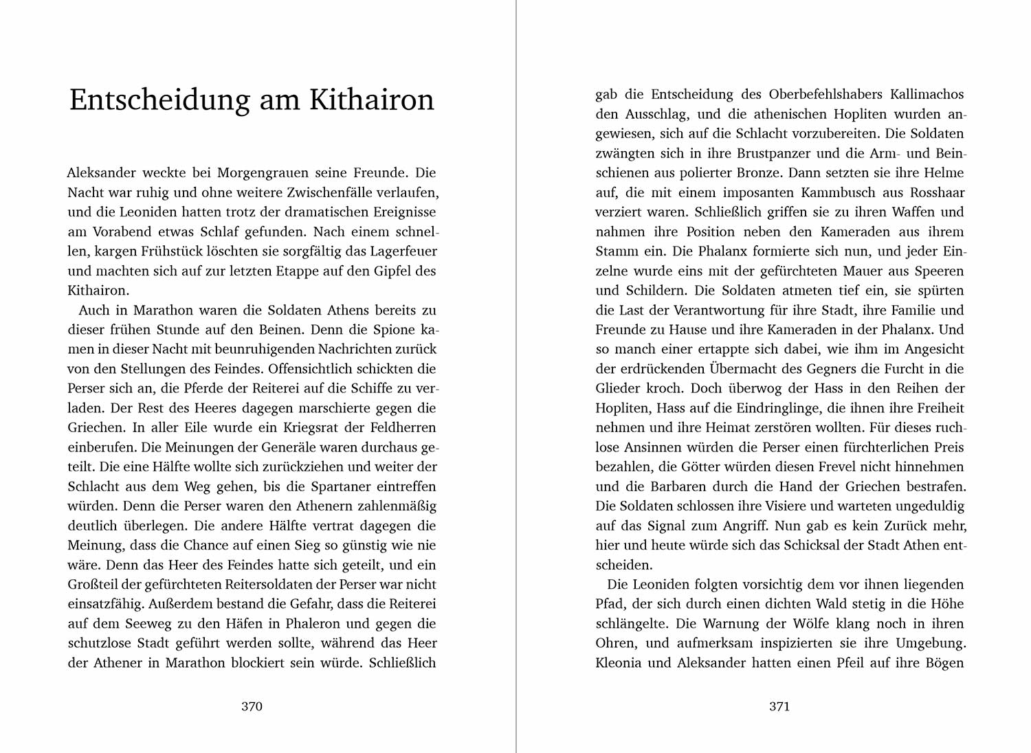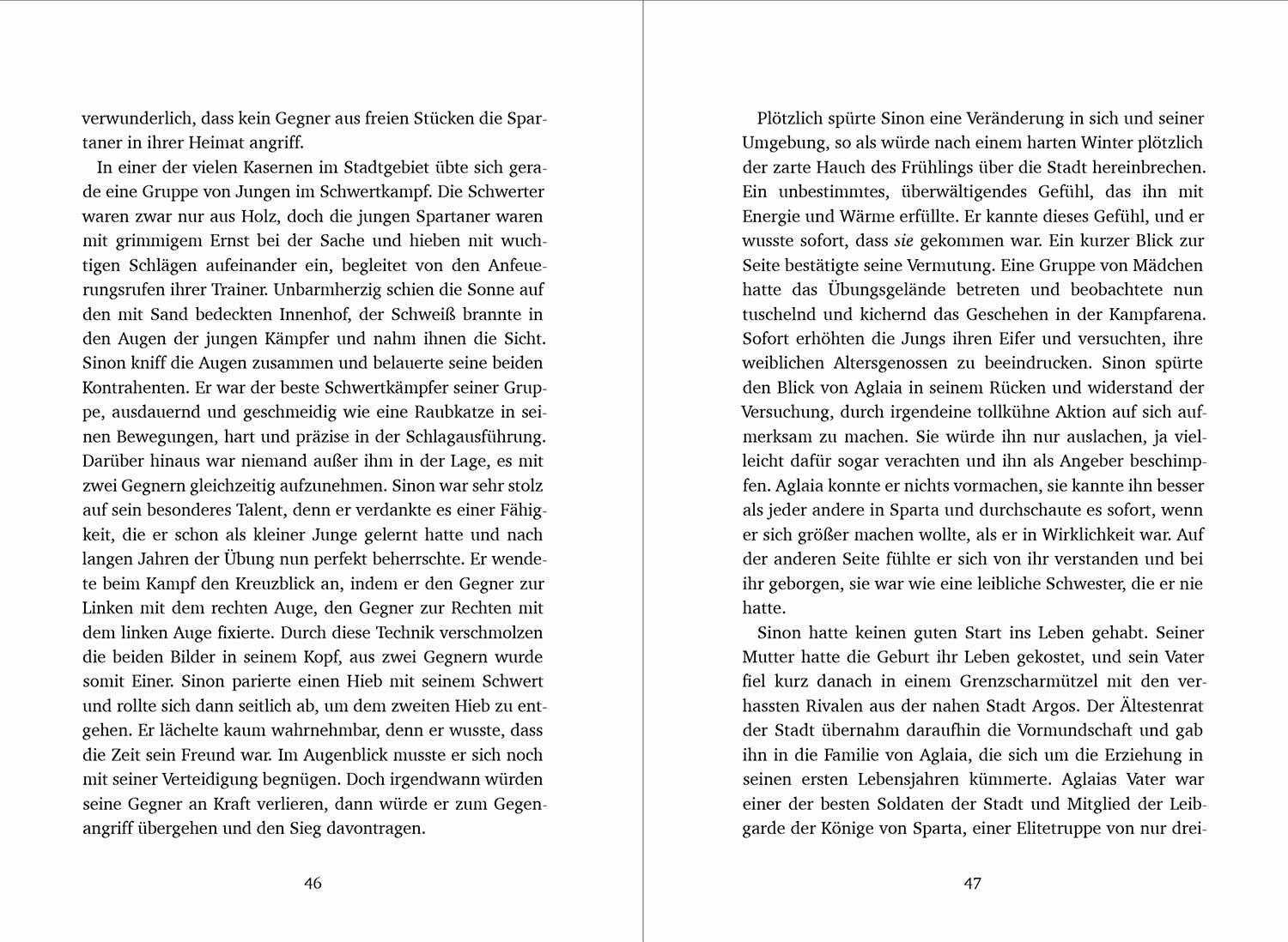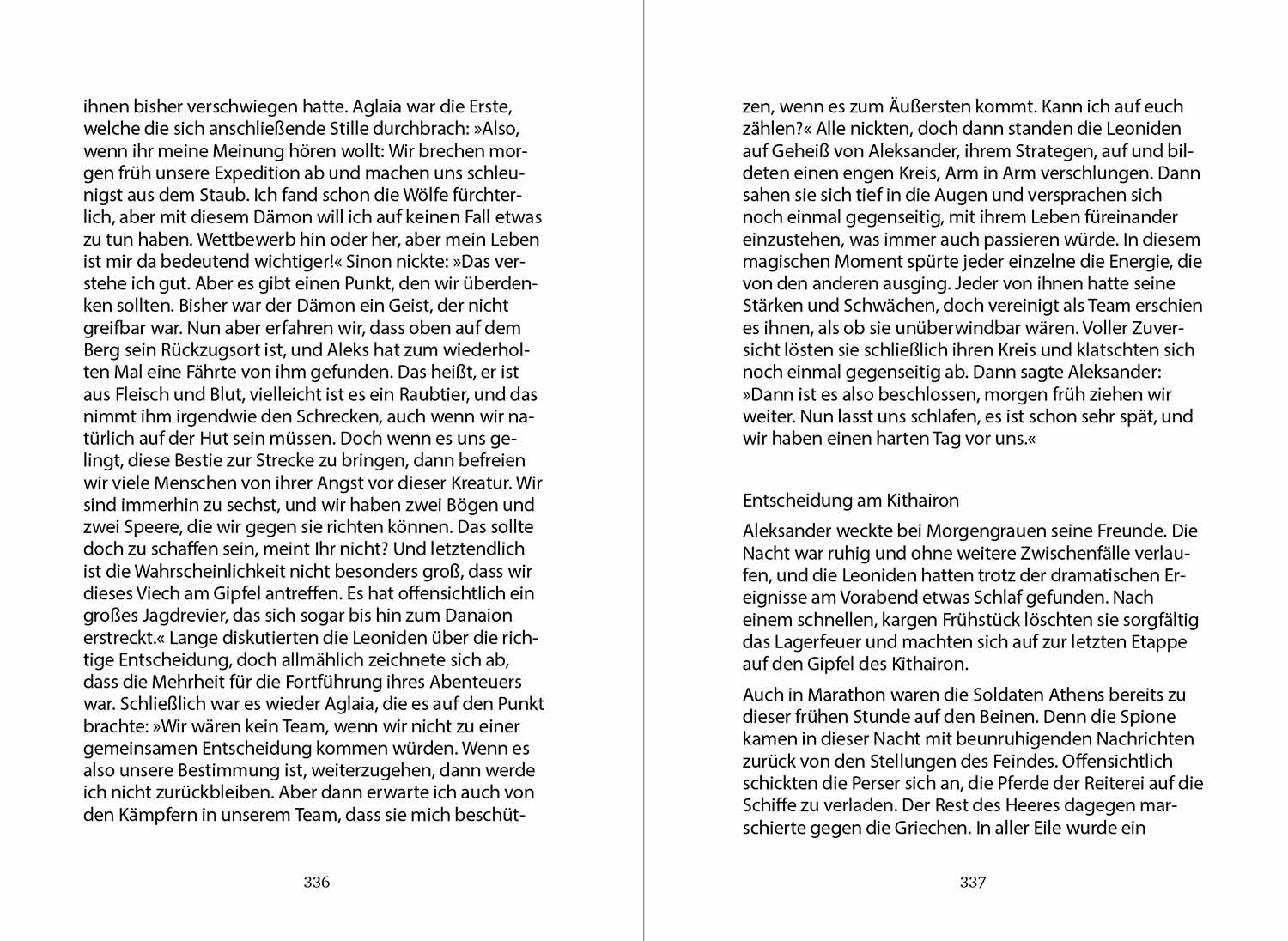 Buchsatz eines historischen Jugendromans: So sahen zwei Buchseiten des spannenden Romans »Die Vollkommene Schar und die Bestie vom Kithairon« aus – nach dem Import des WORD-Manuskripts in das Designprogramm InDesign.