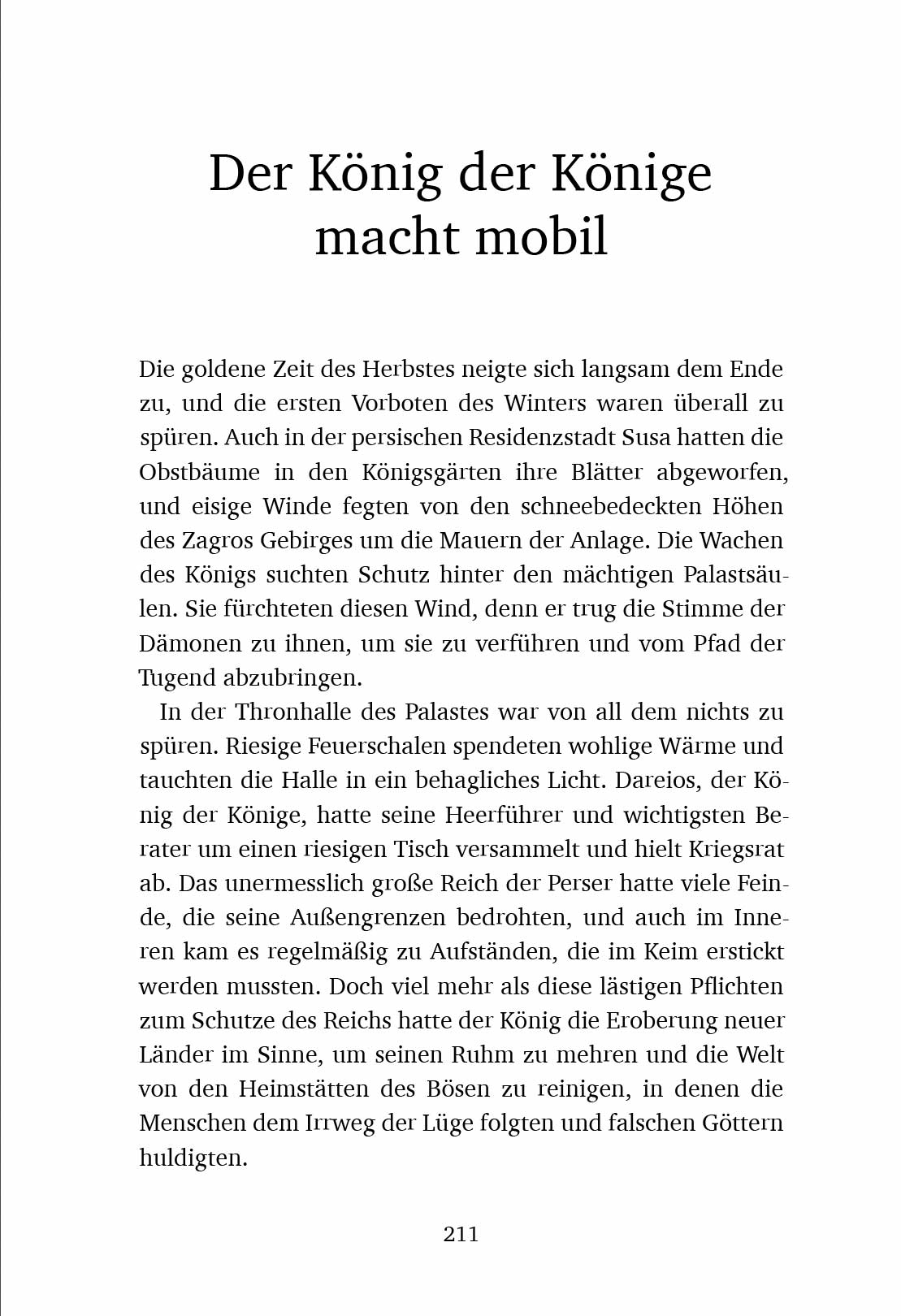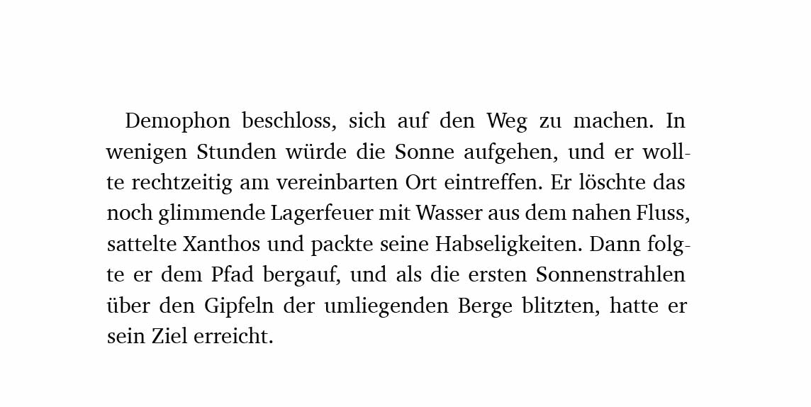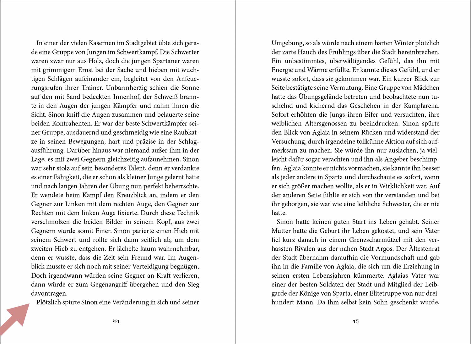 Buchsatz eines historischen Jugendromans: So sahen zwei Buchseiten des spannenden Romans »Die Vollkommene Schar und die Bestie vom Kithairon« aus – nach dem Import des WORD-Manuskripts in das Designprogramm InDesign.