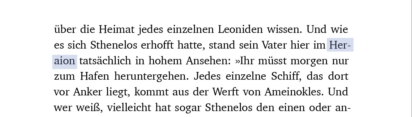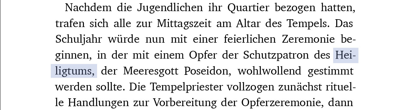 Korrekt getrennt müsste es so getrennt werden: He-raion. Hier muss manuell eingegriffen werden, und ich habe es schließlich so gemacht, dass das Wort gar nicht getrennt wird. Ergebnis: Der Zeilenumbruch des gesamten Absatzes verändert sich.