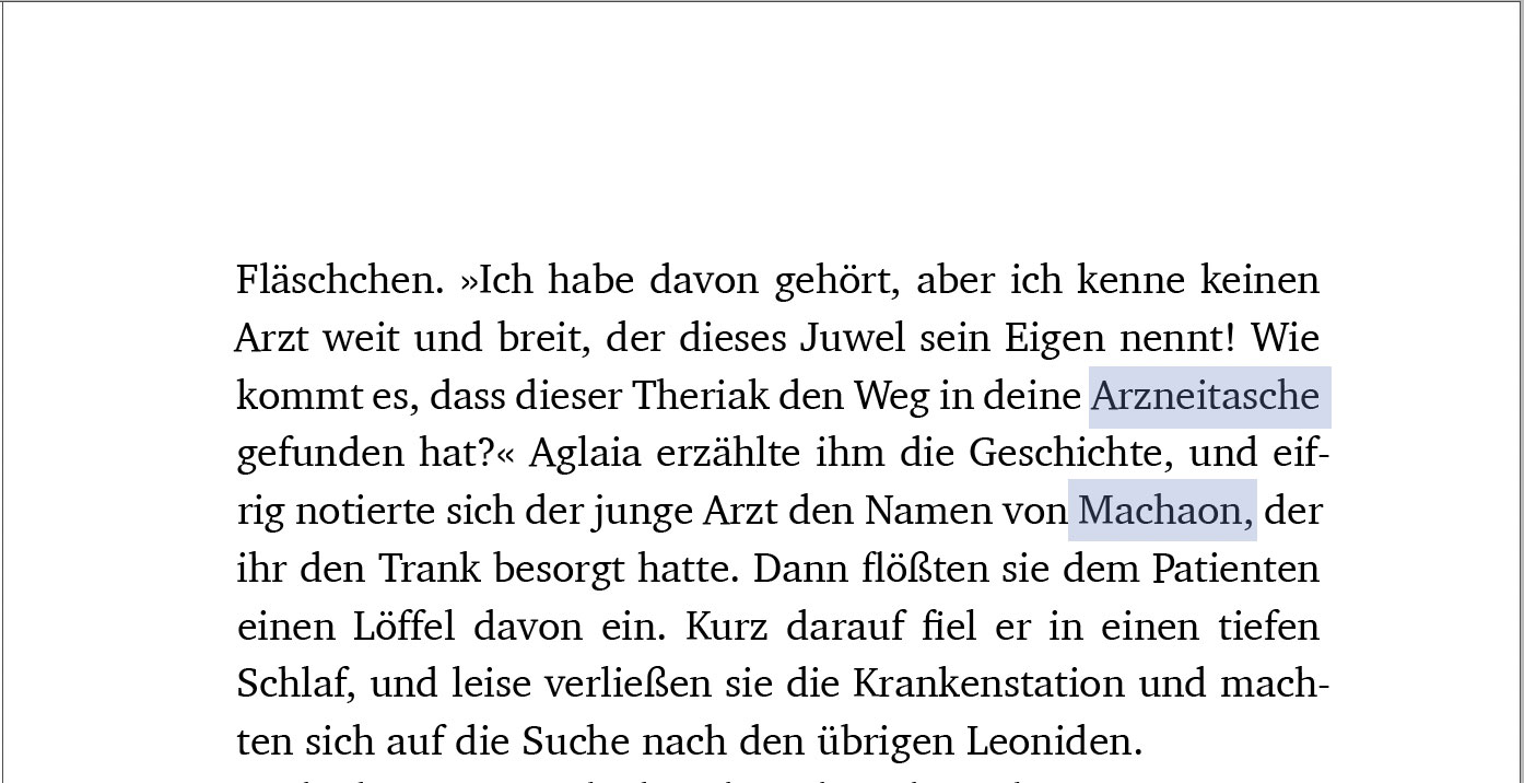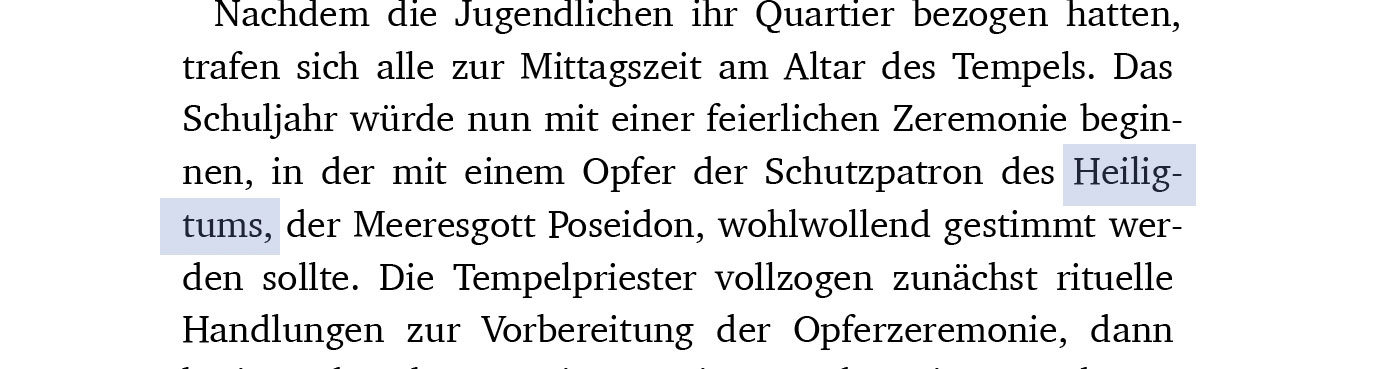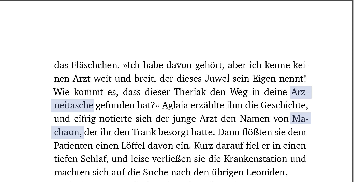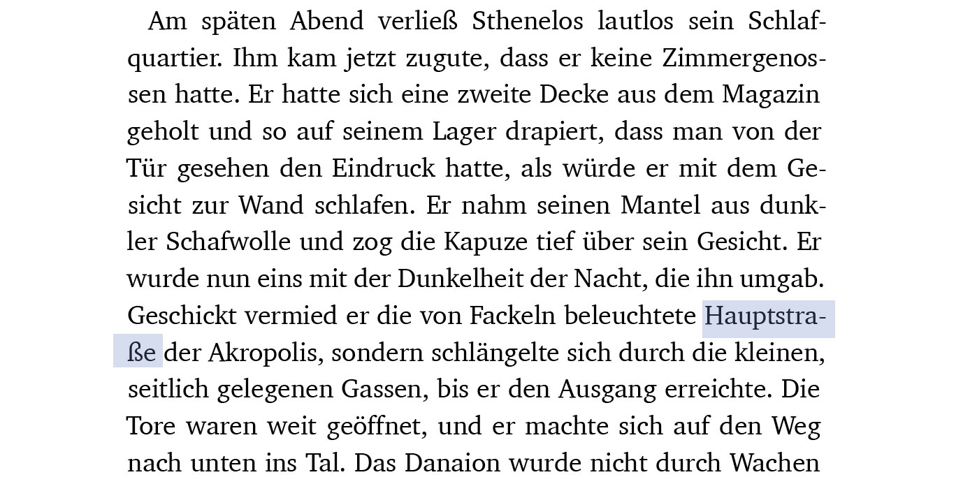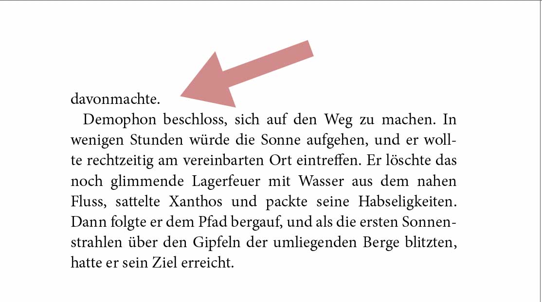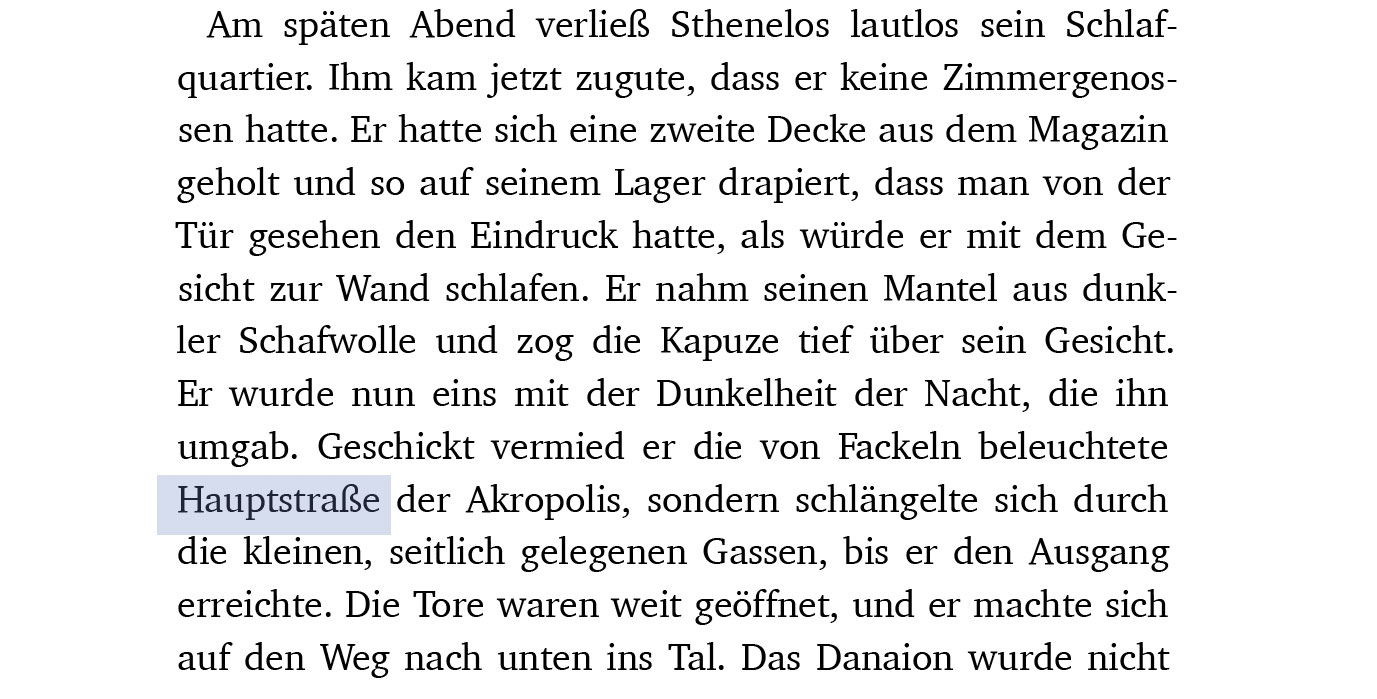 Ein professionelles Satzprogramm wie InDesign trennt zwar ordentlich, aber nicht perfekt. Hin und wieder trennt es auch falsch, speziell in diesem Roman, in dem es von unbekannten Begriffen und Eigennamen nur so wimmelt.
